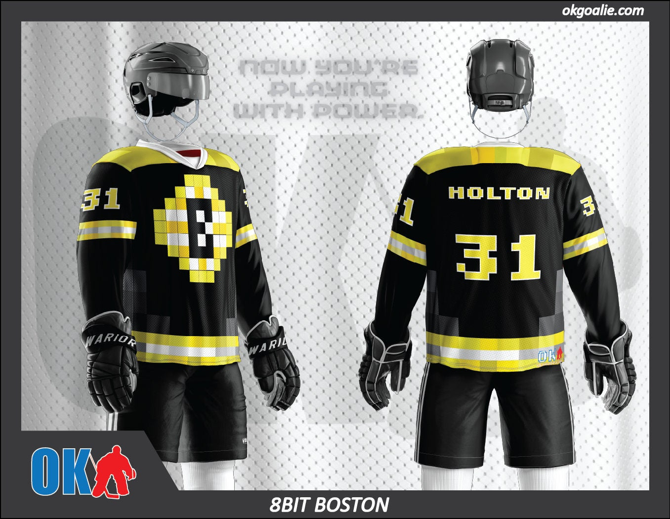 Parody jerseys from your favorite cities! Wear an 8-Bit old school Nintendo looking hockey jersey of your favorite team. Brilliant fully sublimated lightweight jerseys are perfect to wear on the ice, to the game or at your local sports bar. Jerseys come in all normal sizings S, M, L, XL, XXL, and 3 sizes of goalie cut, for one low price. Please allow 4-6 weeks for shipping due to the custom nature of the product. Add your custom name and jersey number in the customization field then choose which jersey mesh you want (standard mesh or lightweight)