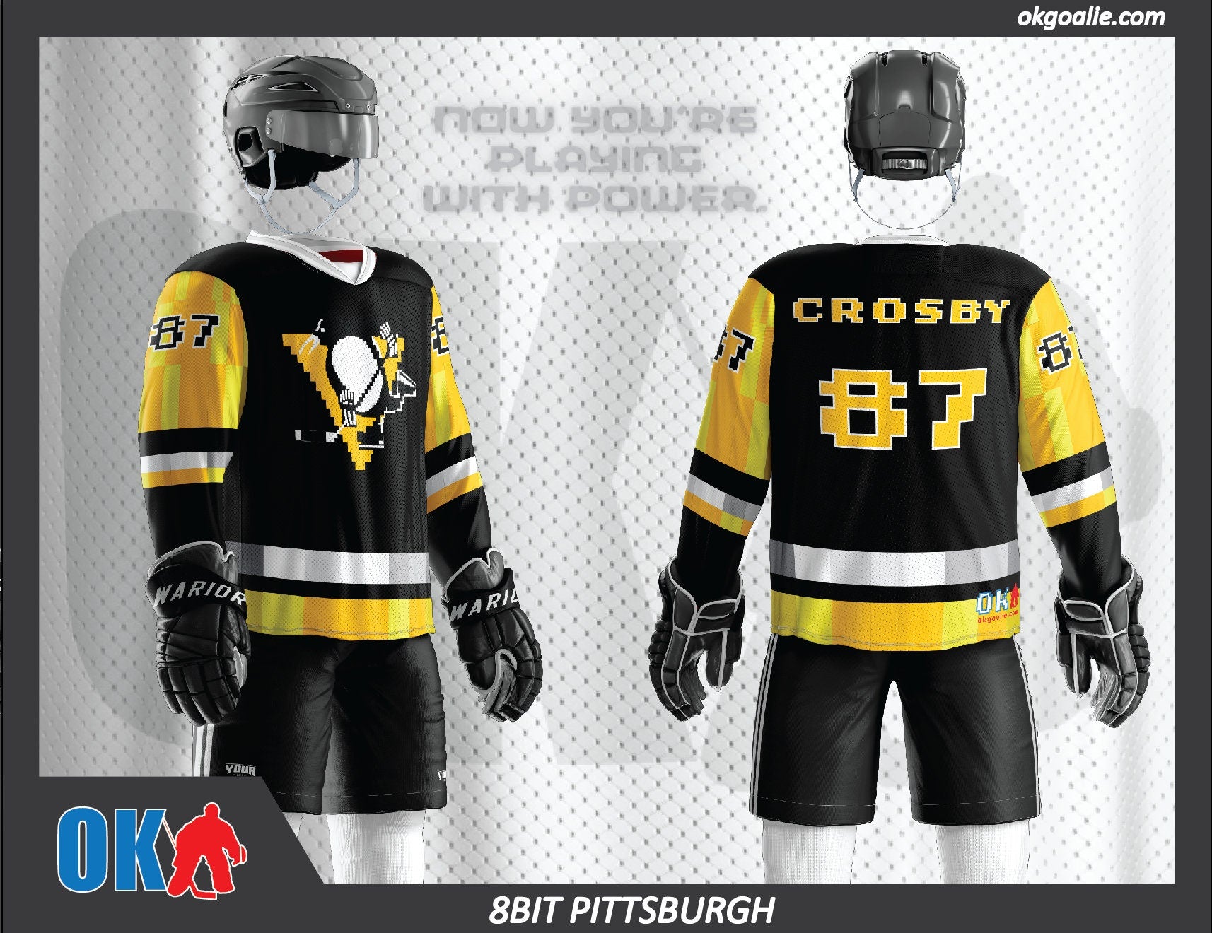 Parody jerseys from your favorite cities! Wear an 8-Bit old school Nintendo looking hockey jersey of your favorite team. Brilliant fully sublimated lightweight jerseys are perfect to wear on the ice, to the game or at your local sports bar. Jerseys come in all normal sizings S, M, L, XL, XXL, and 3 sizes of goalie cut, for one low price. Please allow 4-6 weeks for shipping due to the custom nature of the product. Add your custom name and jersey number in the customization field then choose which jersey mesh you want (standard mesh or lightweight)