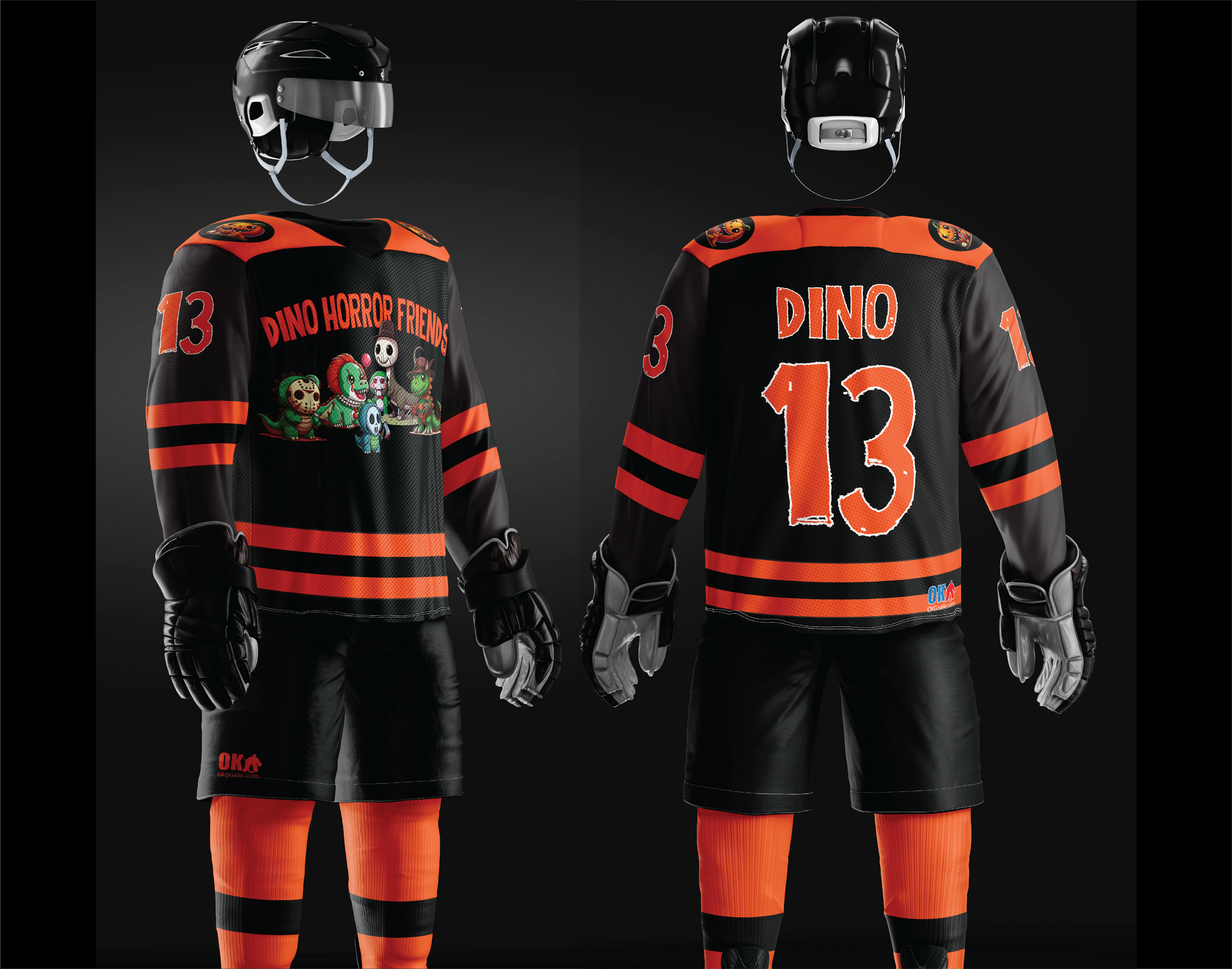Get ready to roar with this adorable hockey jersey featuring cute dinosaurs dressed as iconic horror movie monsters. It's a playful twist on fright night, bringing Jurassic terror with a smile to the ice!