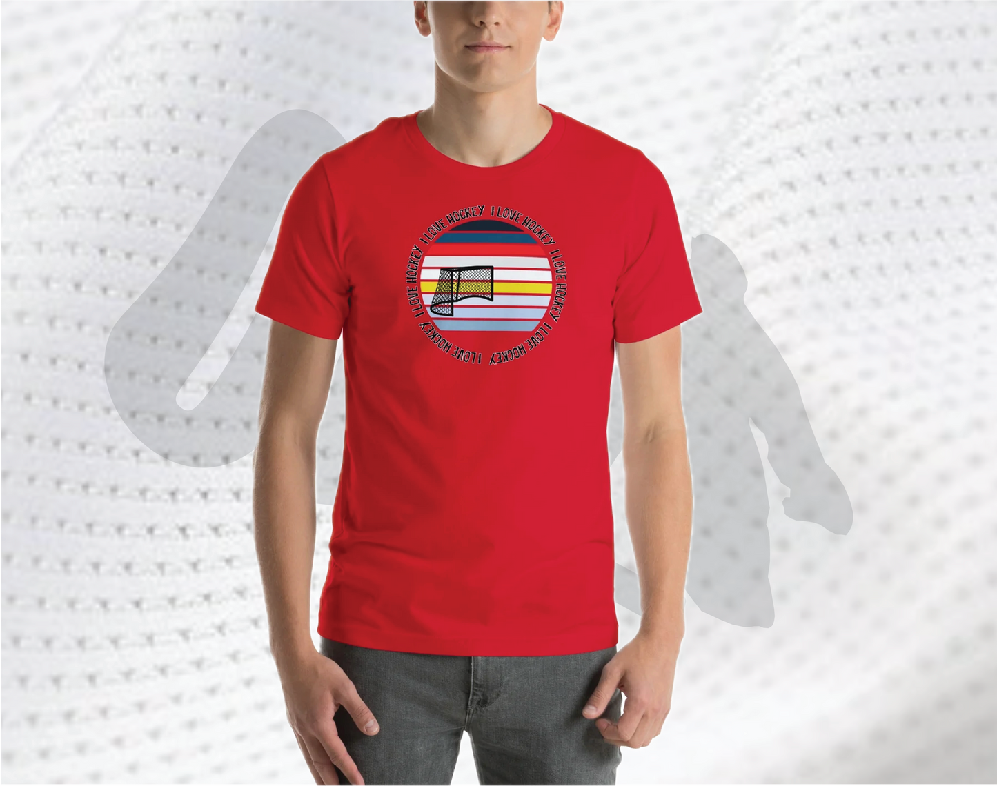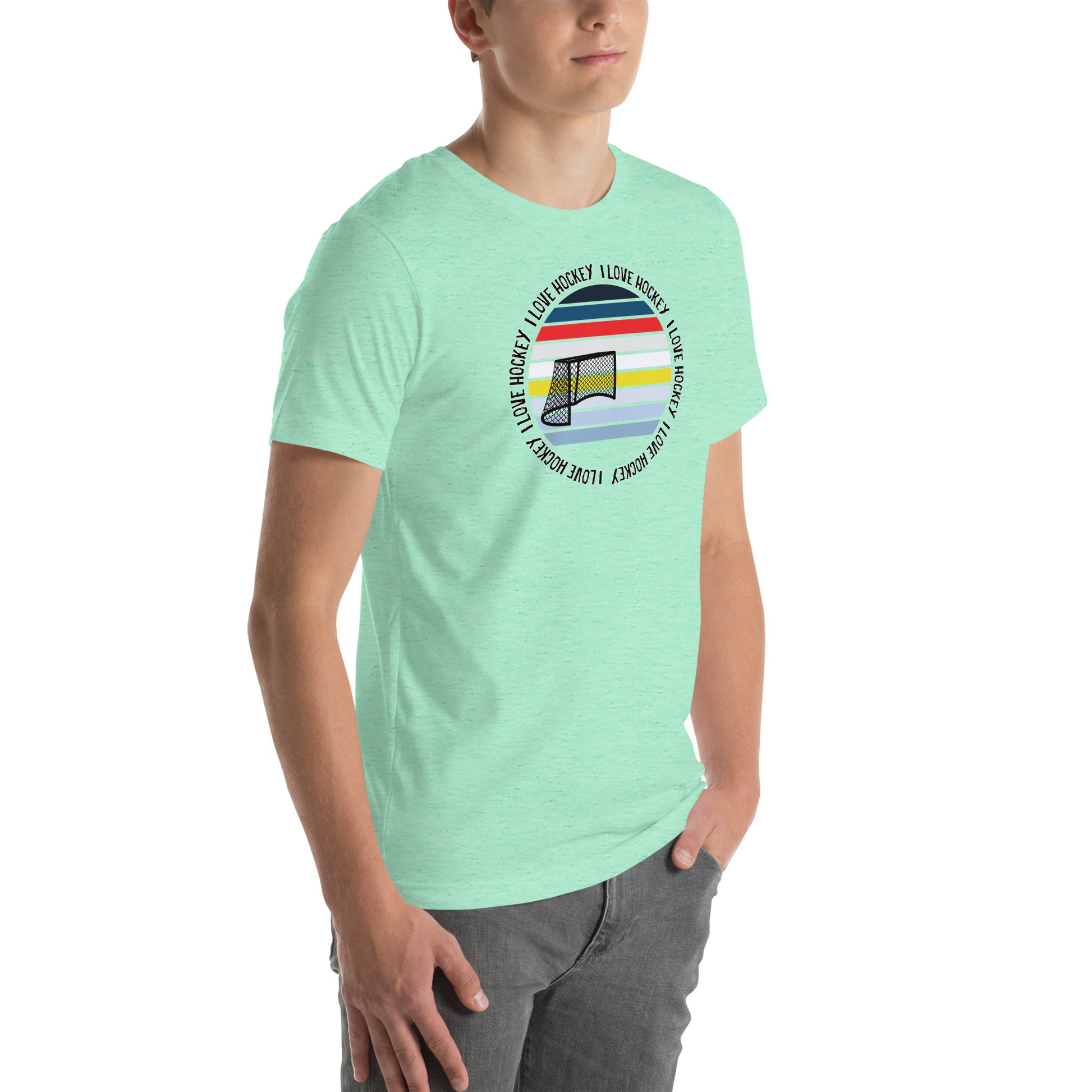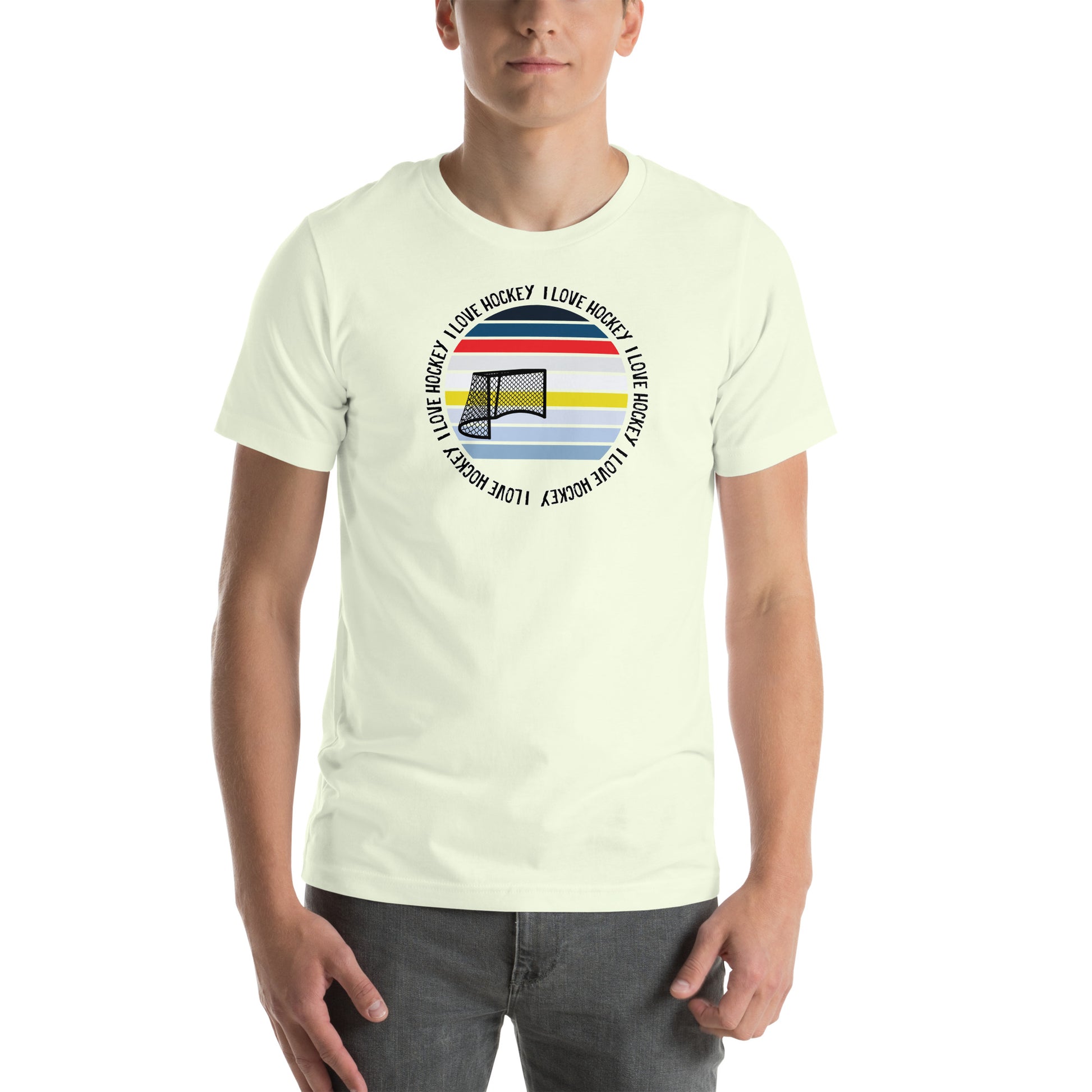 Vintage vibes meet puck passion: 'I Love Hockey' tee featuring a nostalgic hockey net graphic for a timeless expression of love for the game.