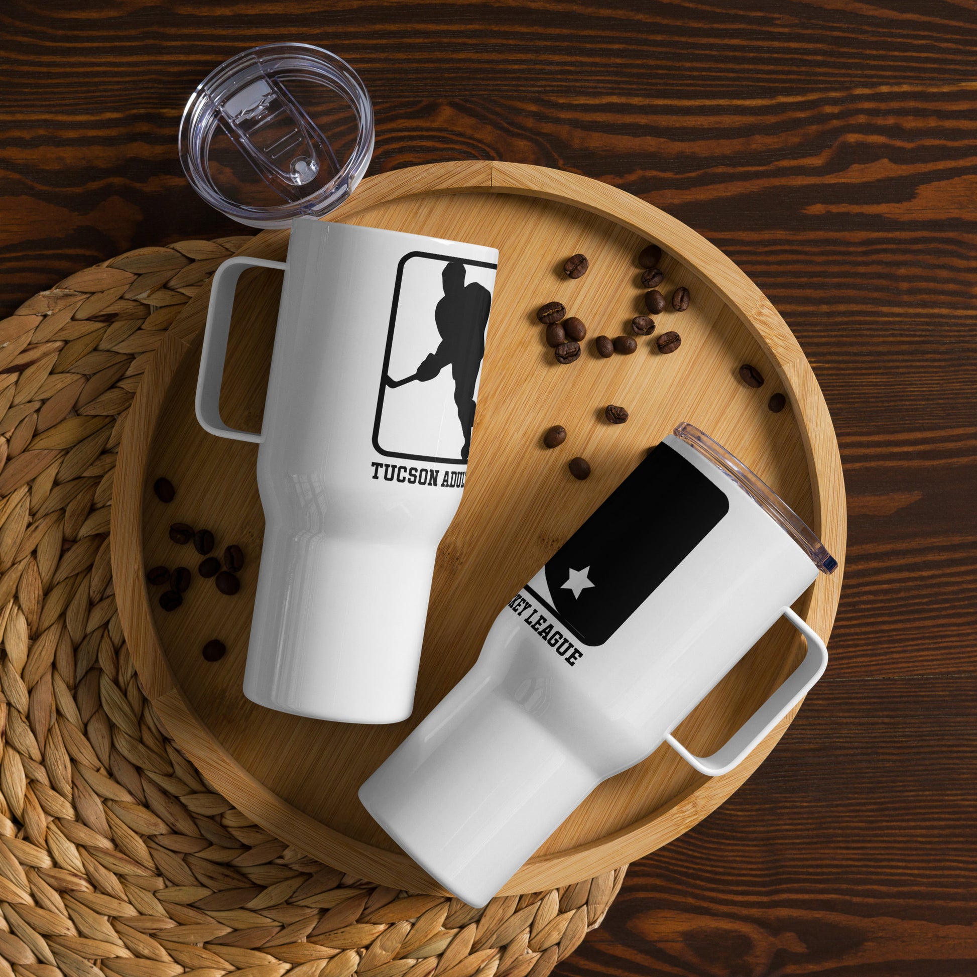 Show your support for the Tucson Adult Hockey League! Sip in style and comfort with an elevated travel mug. With its sleek and durable design, you’ll love taking this mug wherever you go. It fits into most car cup holders and has a spill-proof plastic lid. Commute to work or go on new adventures—this travel mug will keep your beverage safe and at just the right temperature.