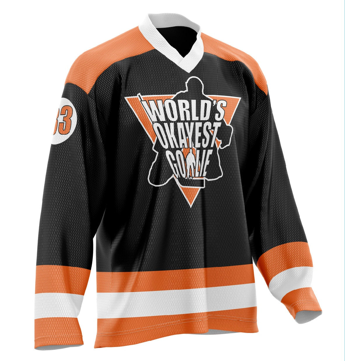 World's Okayest Goalie Hockey Jersey Black/Orange/White
