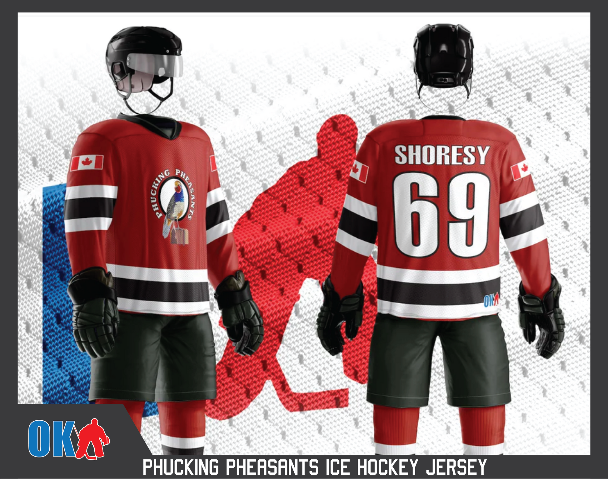You Pheasants ready for some pracy? Grab one of these jerseys ferda. Inspired by the team on Canada's hit series. Crisp coloring and logo design sublimated onto an authentic hockey jersey. Choose one of your favorite players listed or add your own custom name and number at no additional charge! Please allow 4-6 weeks for shipping due to the custom nature of the product. Add your custom name and jersey number in the customization field then choose which jersey mesh you want (standard mesh or lightweight)